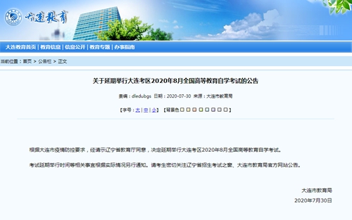 關(guān)于延期舉行大連考區(qū)2020年8月全國(guó)高等教育自學(xué)考試的公告