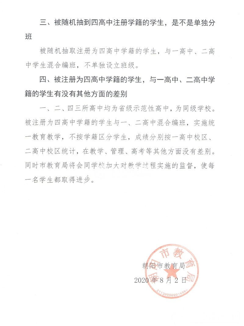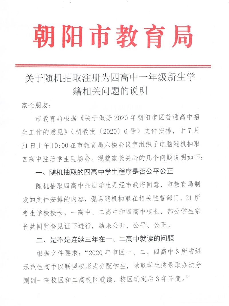 市教育局根據(jù)《關于做好2020年朝陽市區(qū)普通高中招生工作的意見》【朝教發(fā)(2020)6號】文件安排,于7月31日上午10:00在市教育局六樓會議室組織了電腦隨機抽取四高中注冊學生現(xiàn)場會?,F(xiàn)就家長關心的幾個問題說明如下: