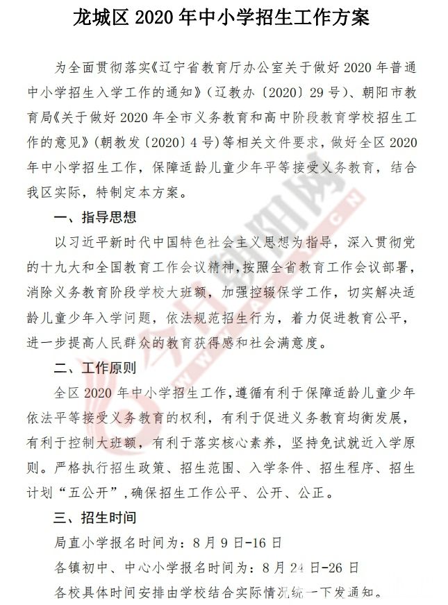 剛剛,本網(wǎng)編輯從朝陽市龍城區(qū)教育局獲悉,為做好全區(qū)2020年中小學招生工作,保障適齡兒童少年平等接受義務教育,結合龍城區(qū)實際,該局印發(fā)了《龍城區(qū)2020年中小學招生工作方案》,對指導思想、工作原則、招生時間、工作要求、保障措施等內(nèi)容進行了詳細解讀?,F(xiàn)分享給大家,但愿能幫到每一位可敬的家長和可愛的小朋友。