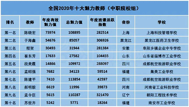 “全國2020年度十大魅力教師(中職院校組)”排名如下: