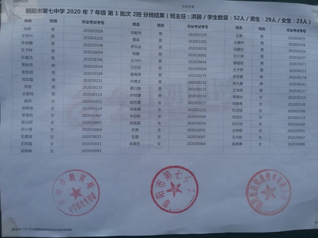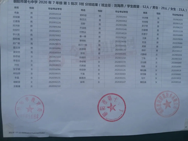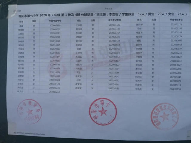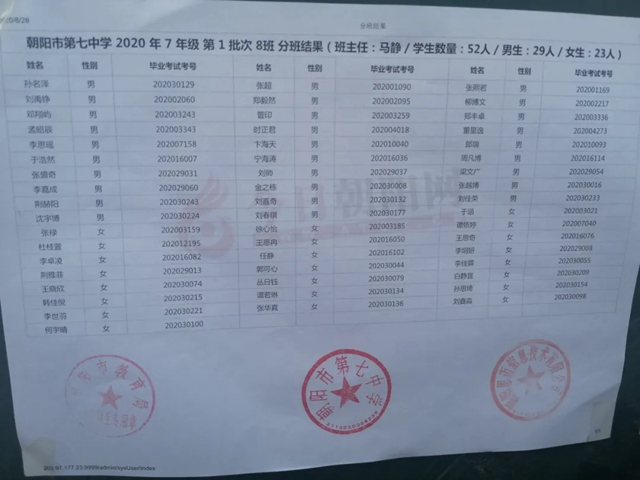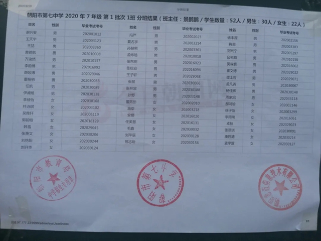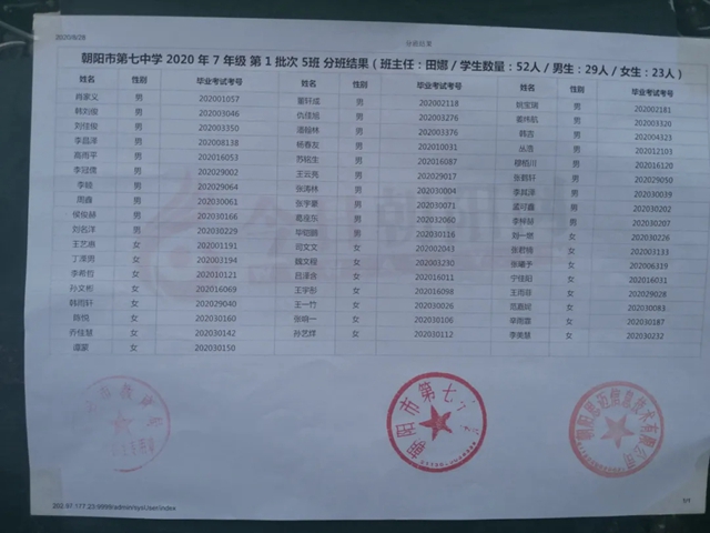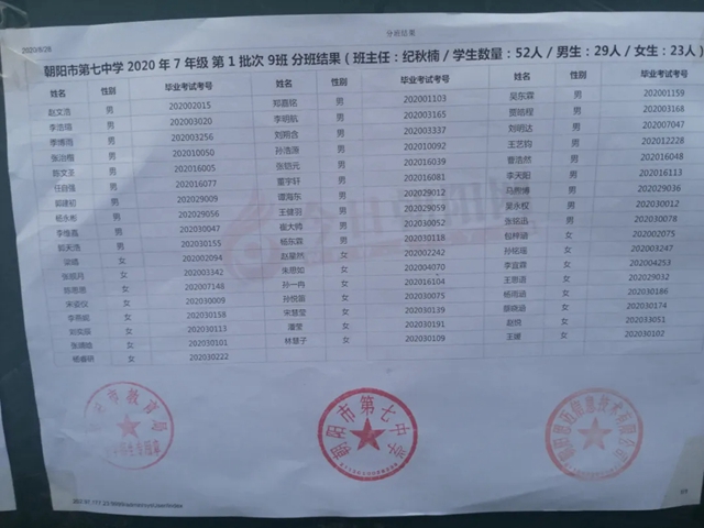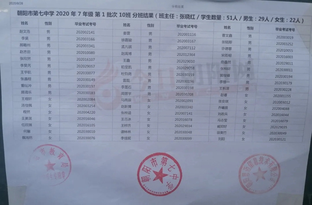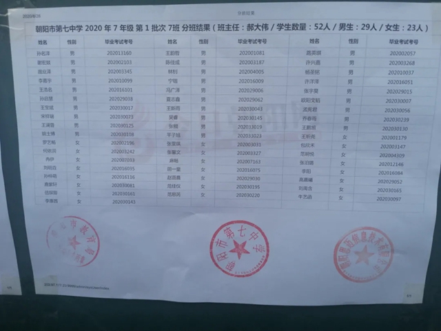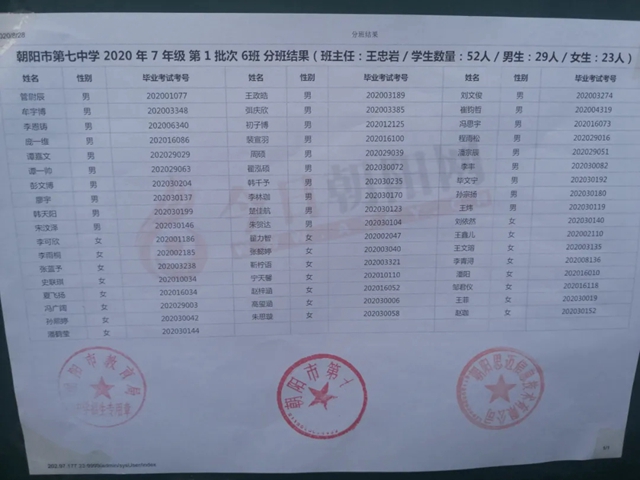 朝陽(yáng)市第七中學(xué)2020年新生分班表(可點(diǎn)擊放大查看)