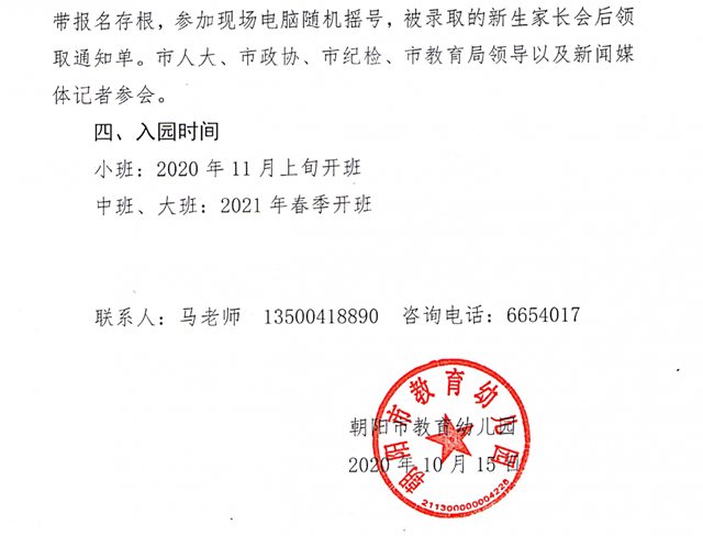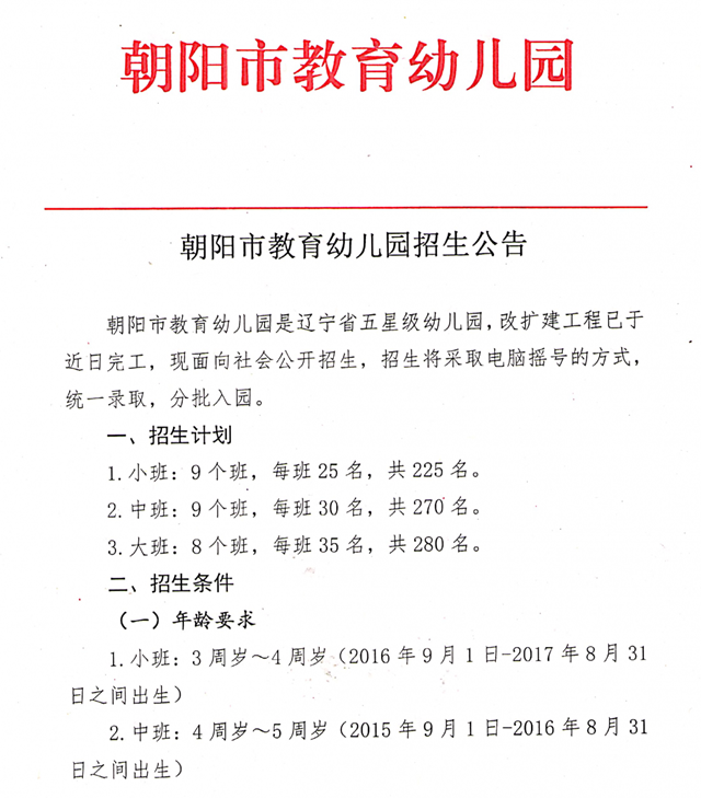 據(jù)了解,招生將采取電腦搖號的方式,統(tǒng)一錄取,分批入園,以充分體現(xiàn)陽光、公正。其中,小班計劃招生225人,中班計劃招生270人,大班計劃招生280人。報名時間是10月18日至10月20日。為更好地服務(wù)廣大市民,本網(wǎng)現(xiàn)予編發(fā)該園《招生公告》,敬請各位網(wǎng)友轉(zhuǎn)發(fā)。