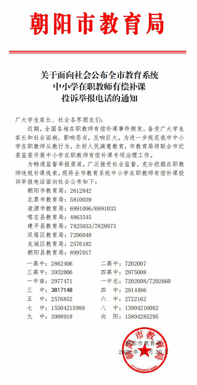 零容忍!朝陽市教育局公布中小學(xué)在職教師有償補(bǔ)課投訴舉報(bào)電話