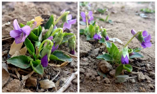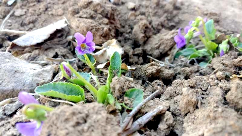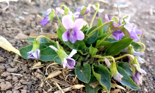 蹲下身子仔細看,原來是紫花地丁。紫花地丁是草本植物,別名野堇菜或光瓣堇菜,民間也叫堇堇菜。紫花地丁花果期為四月中下旬至九月,可作觀賞花卉,嫩葉可作野菜,全草可入藥,有涼血消腫、清熱利濕的功效。