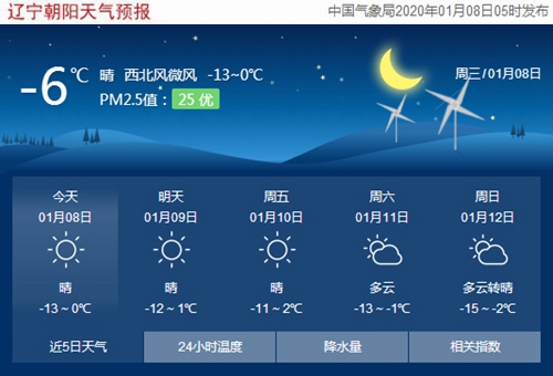 今天是2020年1月8日,星期三,農(nóng)歷臘月十四,二九第九天。遼寧朝陽晴,氣溫-13~0℃,西北風(fēng)4~5級,空氣質(zhì)量優(yōu)。日出時間:07:25;日落時間:16:44(中國氣象局2020年1月8日5時發(fā)布),請隨時關(guān)注天氣變化。