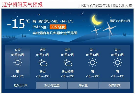 今天是2020年1月10日,星期五,農歷臘月十六,三九第二天。遼寧朝陽晴,氣溫-14~1℃,西北風微風,空氣質量輕度污染。日出時間:07:25;日落時間:16:46(中國氣象局2020年1月10日5時發(fā)布),請隨時關注天氣變化。