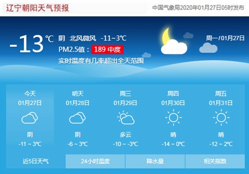 今天是2020年1月27日,星期一,農(nóng)歷正月初三,五九第一天。遼寧朝陽(yáng)陰,氣溫-11~3℃,北風(fēng)微風(fēng),空氣質(zhì)量中度污染。日出時(shí)間:07:17;日落時(shí)間:17:06(中國(guó)氣象局2020年1月27日5時(shí)發(fā)布),請(qǐng)隨時(shí)關(guān)注天氣變化。
