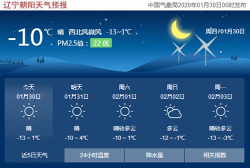 今天是2020年1月30日,星期四,農(nóng)歷正月初六,五九第四天。遼寧朝陽晴,氣溫-13~1℃,西北風(fēng)微風(fēng),空氣質(zhì)量優(yōu)。日出時(shí)間:07:14;日落時(shí)間:17:09(中國氣象局2020年1月30日5時(shí)發(fā)布),請隨時(shí)關(guān)注天氣變化。