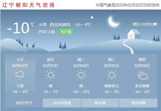 今天是2020年2月2日,星期日,農(nóng)歷正月初九,五九第七天。遼寧朝陽(yáng)小雪,氣溫-16~-4℃,東北風(fēng)3~5級(jí),空氣質(zhì)量?jī)?yōu)。日出時(shí)間:07:11;日落時(shí)間:17:13(中國(guó)氣象局2020年2月2日5時(shí)發(fā)布),請(qǐng)隨時(shí)關(guān)注天氣變化。