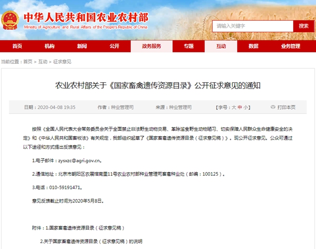 4月8日,農(nóng)業(yè)農(nóng)村部在其官網(wǎng)公布了《國(guó)家畜禽遺傳資源目錄(征求意見(jiàn)稿)》(簡(jiǎn)稱《目錄》)并向社會(huì)公開(kāi)征求意見(jiàn),《目錄》包括家養(yǎng)的傳統(tǒng)畜禽和特種畜禽共31個(gè)種。列入《目錄》的動(dòng)物,意味著按照家畜家禽進(jìn)行管理,可以用于食用等商業(yè)利用。
