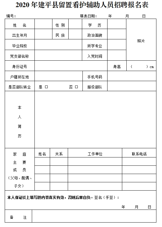 1.報(bào)名者下載并填寫《2020年建平縣紀(jì)委監(jiān)委留置看護(hù)輔助人員招聘報(bào)名表》(附件1),并粘貼近期一寸正面免冠彩色照片。