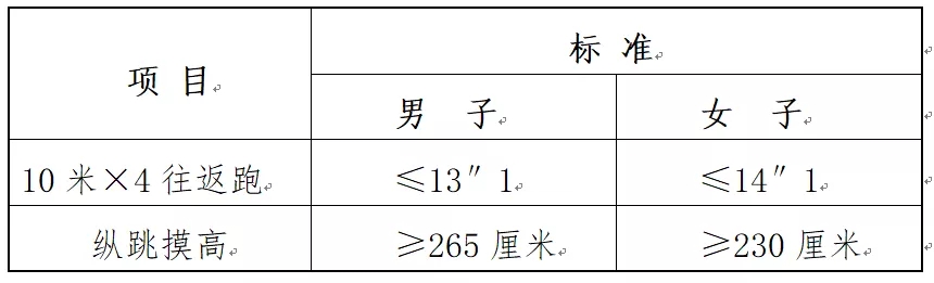 測試方法為:準(zhǔn)備測試階段,受測者雙腳自然分開,呈站立姿勢。接到指令后,受測者屈腿半蹲,雙臂盡力后擺,然后向前上方快速擺臂,雙腿同時發(fā)力,盡力垂直向上起跳,同時單手舉起觸摸固定的高度線或高度標(biāo)識,觸摸到高度線或者高度標(biāo)識的視為合格。測試不超過三次。