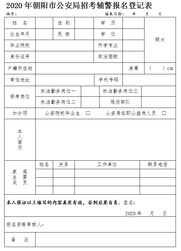 2.報名者請自行下載《2020年朝陽市公安局招考輔警報名登記表》(附件),填好后打印并粘貼近期一寸正面免冠彩色照片。