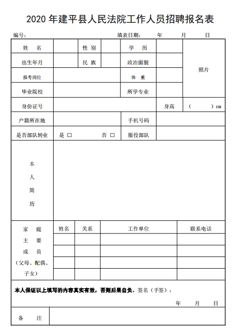 1.報名者下載并填寫《2020年建平縣人民法院工作人員招聘報名表》(附件1),并粘貼近期一寸正面免冠彩色照片。
