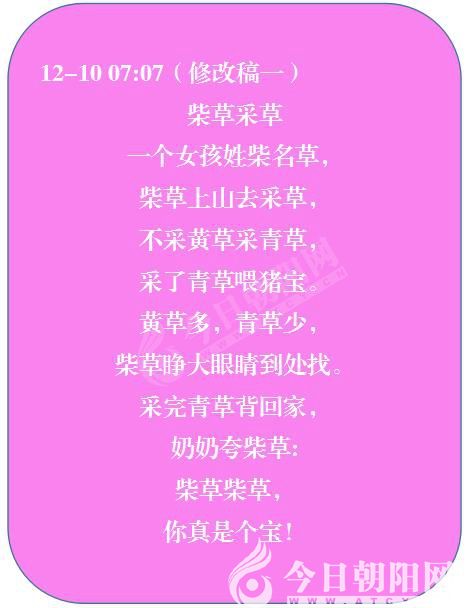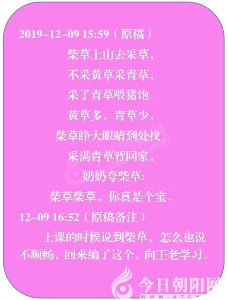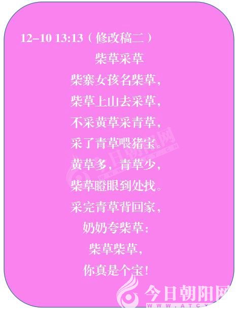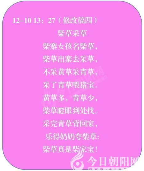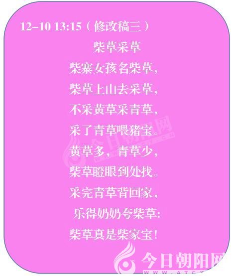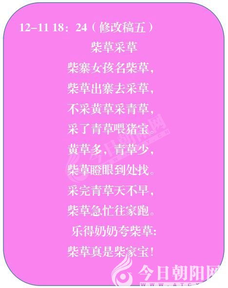 劉老師想到把這兩個(gè)字寫(xiě)進(jìn)一則繞口令,于是構(gòu)思了一個(gè)姓柴名草的女孩兒打豬草受到奶奶夸獎(jiǎng)的故事,幾經(jīng)修改,形成了繞口令《柴草采草》。草稿完成后,傳到喀左王學(xué)英手里,又加以潤(rùn)色。