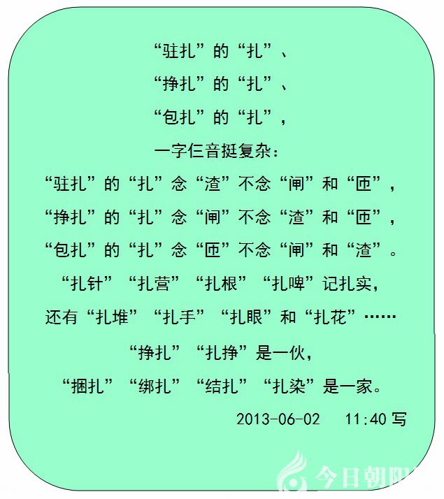 摘要:“駐扎”的“扎”、“掙扎”的“扎”、“包扎”的“扎”,一字仨音挺復(fù)雜。