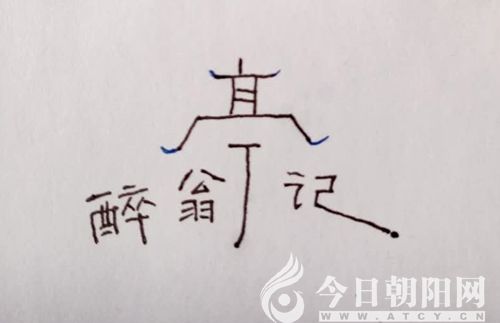 寫個高大些的“亭”字,左下寫傾斜體的“醉翁”,右下寫“記”。