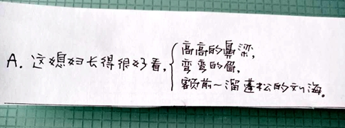 A.這媳婦長(zhǎng)得很好看,高高的鼻梁,彎彎的眉,額前一溜蓬松的劉海。