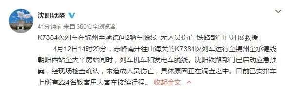 4月12日14時29分,赤峰南開往山海關(guān)的K7384次列車運行至錦州至承德線朝陽西站至大平房站間時,列車機(jī)車和發(fā)電車脫線。沈陽鐵路部門已啟動應(yīng)急預(yù)案,經(jīng)現(xiàn)場檢查確認(rèn),未造成人員傷亡,具體原因正在調(diào)查之中。目前已安排車上所有224名旅客用大客車接續(xù)行程。