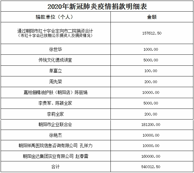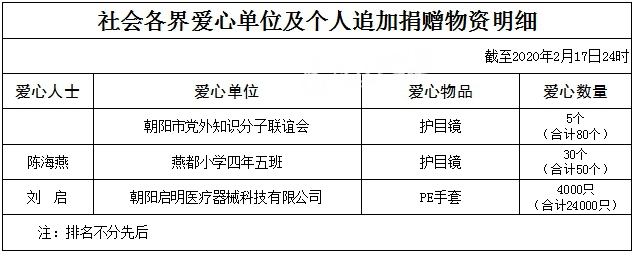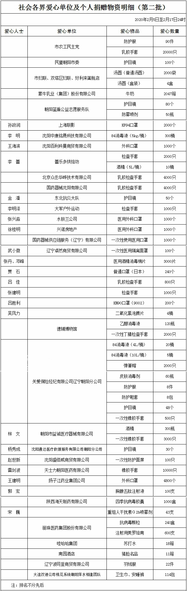 遼寧省朝陽(yáng)市第二醫(yī)院本著公開、透明的原則,繼第一批捐贈(zèng)物資明細(xì)公布后,又陸續(xù)收到了幾十家單位及個(gè)人的愛心捐贈(zèng)。現(xiàn)將第二批捐贈(zèng)情況(截至2020年2月17日24時(shí))公布如下: