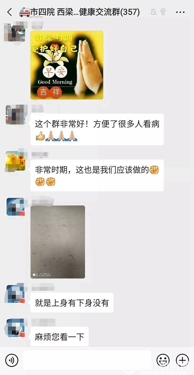 2月5日,為降低市民到醫(yī)院就診發(fā)生交叉感染的風險,減輕恐慌情緒,市四院西梁分院特開通“線上免費咨詢”服務,建立了“健康交流群”。針對內科、外科、兒科、婦科、耳鼻喉科、口腔科等相關疾病提供網上免費咨詢,給予專業(yè)的指導,同時進行醫(yī)學科普知識宣傳。