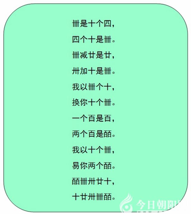 這是一則很特殊的繞口令,以五個漢字十、廿、卅、卌、皕入令,一個比一個難,既熟悉又陌生。