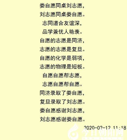 婁自愿與同桌劉志愿,志同道合,互相幫助。婁自愿的志愿是上海的同濟(jì)大學(xué),劉志愿的志愿是上海的復(fù)旦大學(xué)。婁自愿的化學(xué)是弱項(xiàng),劉志愿的物理是短板。婁自愿幫劉志愿補(bǔ)習(xí)物理,劉志愿幫婁自愿補(bǔ)習(xí)化學(xué)。