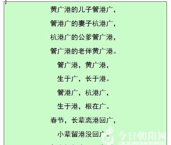 人物命名看似雜亂無章離奇古怪,但為了滿足繞口令文體要求,不得不然。剝開表象外衣,四個(gè)名字是很有規(guī)律的。老一輩兒,翁為管廣港、嫗為黃廣港;小一輩兒,子為管港廣、媳為杭港廣。姓名中含身世,別具匠心。