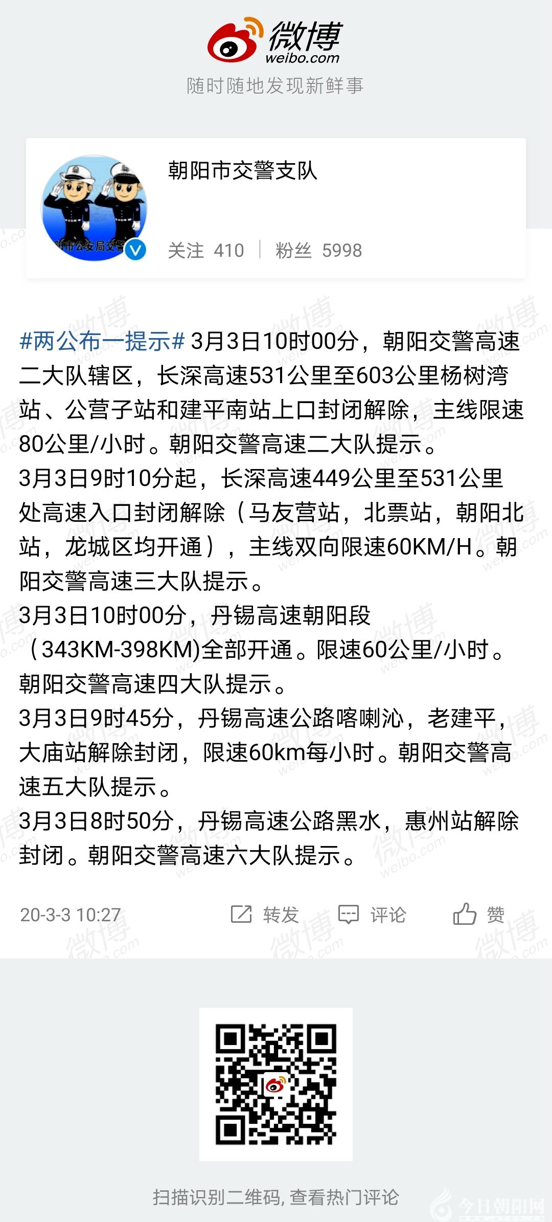 3月3日8時(shí)50分,丹錫高速公路黑水,惠州站解除封閉。朝陽交警高速六大隊(duì)提示。