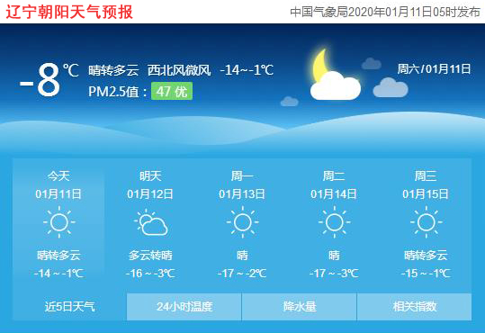 今天是2020年1月11日,星期六,農(nóng)歷臘月十七,三九第三天。遼寧朝陽晴轉(zhuǎn)多云,氣溫-14~-1℃,北風(fēng)3~5級,空氣質(zhì)量優(yōu)。日出時間:07:25;日落時間:16:47(中國氣象局2020年1月11日5時發(fā)布),請隨時關(guān)注天氣變化。