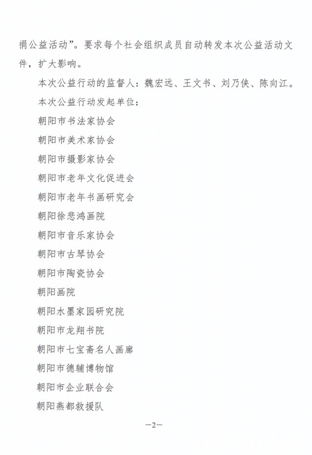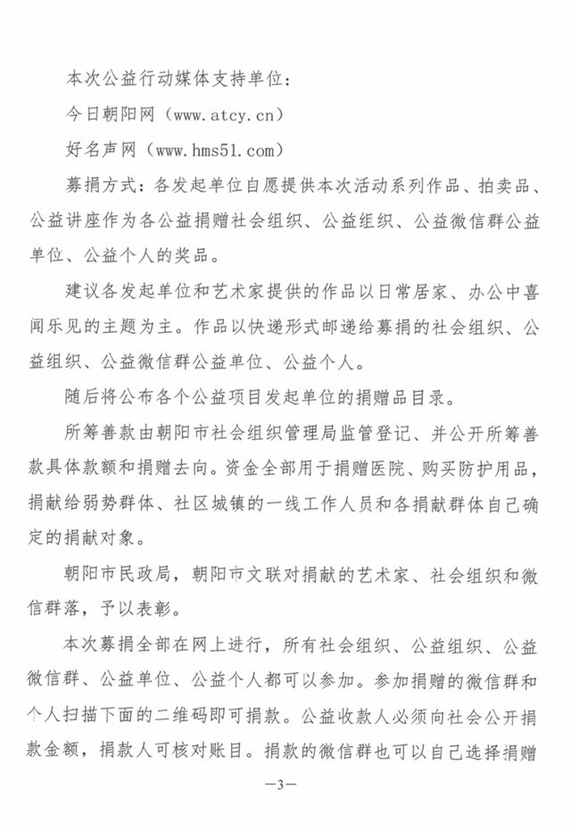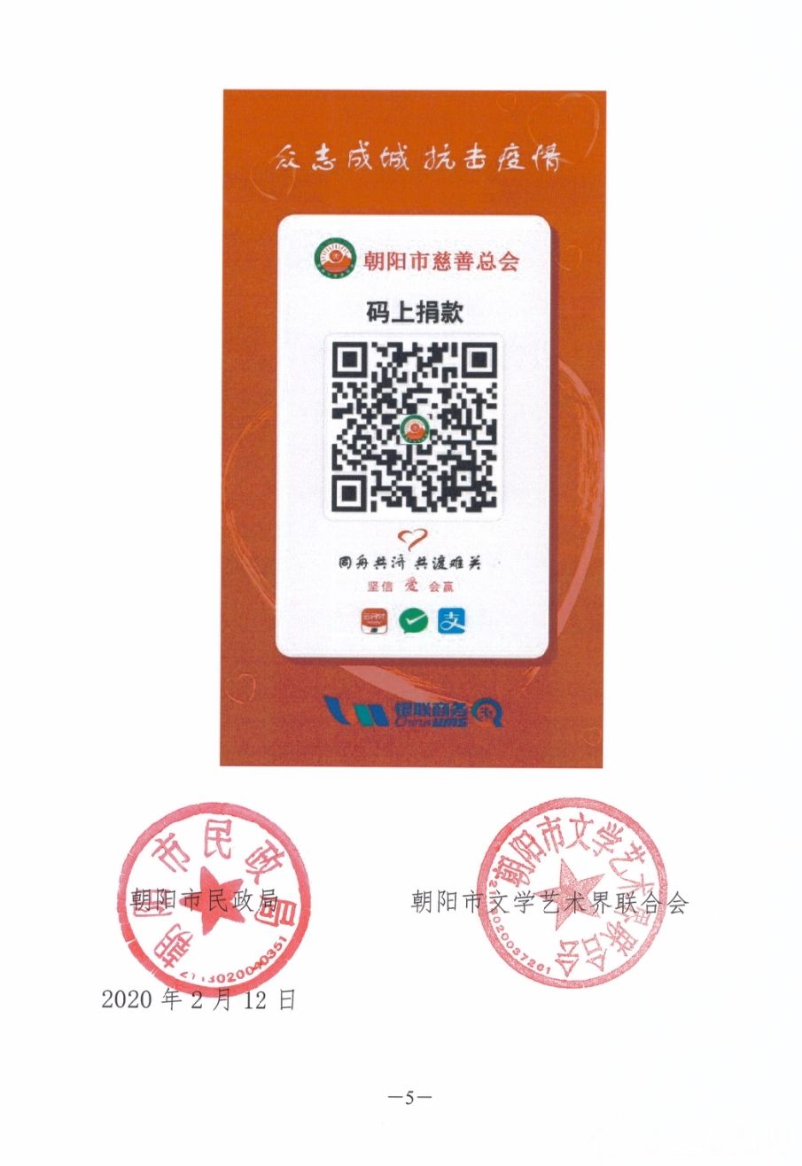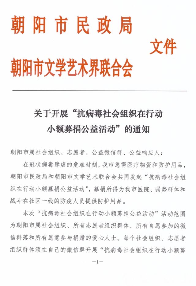 由遼寧省朝陽市民政局、朝陽市文學(xué)藝術(shù)界聯(lián)合會(huì)聯(lián)手開展的抗病毒公益活動(dòng)現(xiàn)已拉開大幕。本網(wǎng)作為協(xié)辦單位,強(qiáng)烈呼吁340萬朝陽兒女踴躍參加,為打贏這場(chǎng)特殊戰(zhàn)爭(zhēng)提供強(qiáng)大的物質(zhì)與精神支持!
