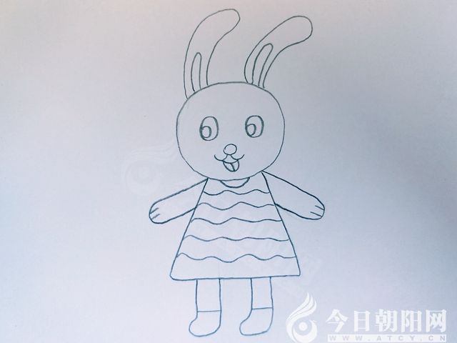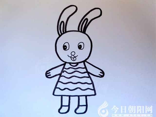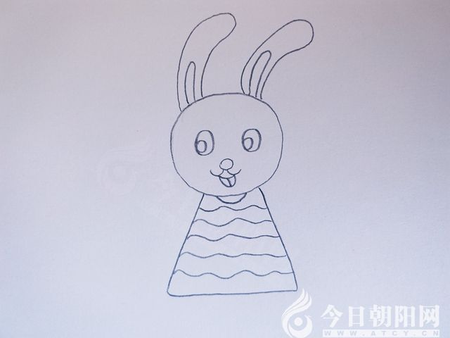 用半圓形狀畫出小白兔的衣領(lǐng),用曲線畫出衣服上的條紋。