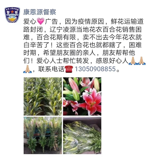結(jié)束本職工作回到朝陽市公安局后,他立即聯(lián)系朝陽市內(nèi)的親屬、朋友幫忙找銷路。經(jīng)過多方努力,最終在康恩源大力協(xié)調(diào)幫助下,2月14日,朝陽市區(qū)的董女士愿意收購該花農(nóng)家即將到花期棚內(nèi)的全部鮮花,目前已收購9000余株,后續(xù)還將對該花農(nóng)種植的鮮花按花期進行收購,直至所有鮮花銷售完畢。截至目前,已為花農(nóng)挽回經(jīng)濟損失共計2萬余元。