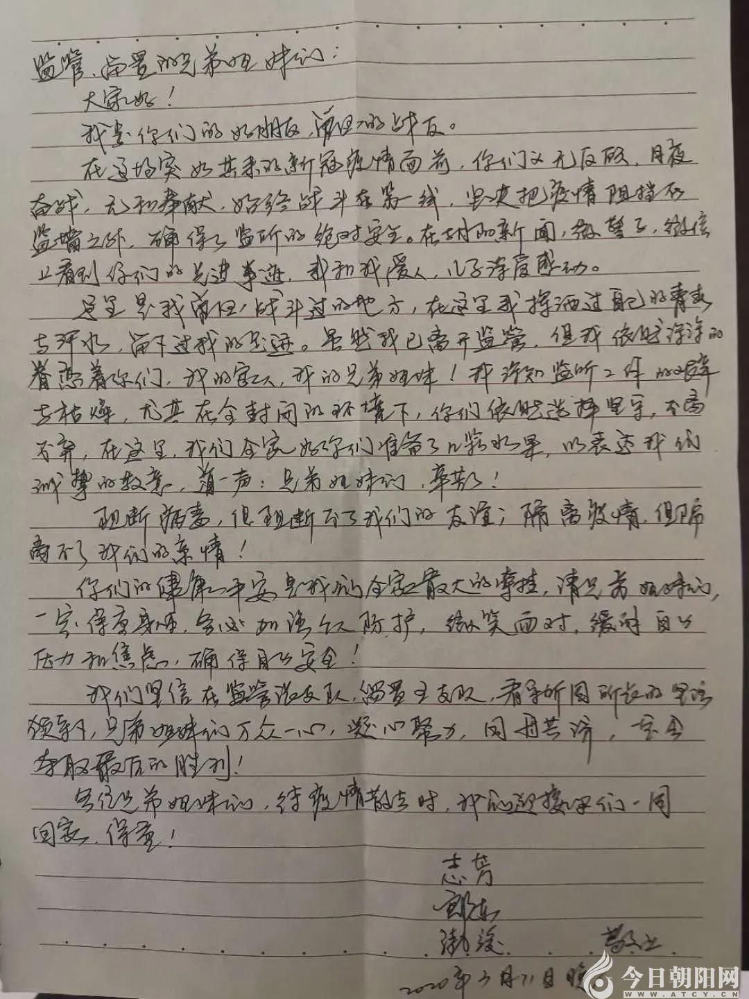 就是因?yàn)檫@份“了解”,王志芳同妻兒一起,帶上一封信、幾箱水果來到看守所,將它們送到門衛(wèi)手里。當(dāng)他手寫的那份書信被戰(zhàn)友們慢慢展開,一股股暖流瞬間流入每個人的心里。“阻擋病毒,但阻斷不了我們的友誼,隔離疫情,但隔離不了我們的親情。”這一句句發(fā)自肺腑的話語無不激勵著戰(zhàn)友們的干勁兒和繼續(xù)堅守下去的決心。