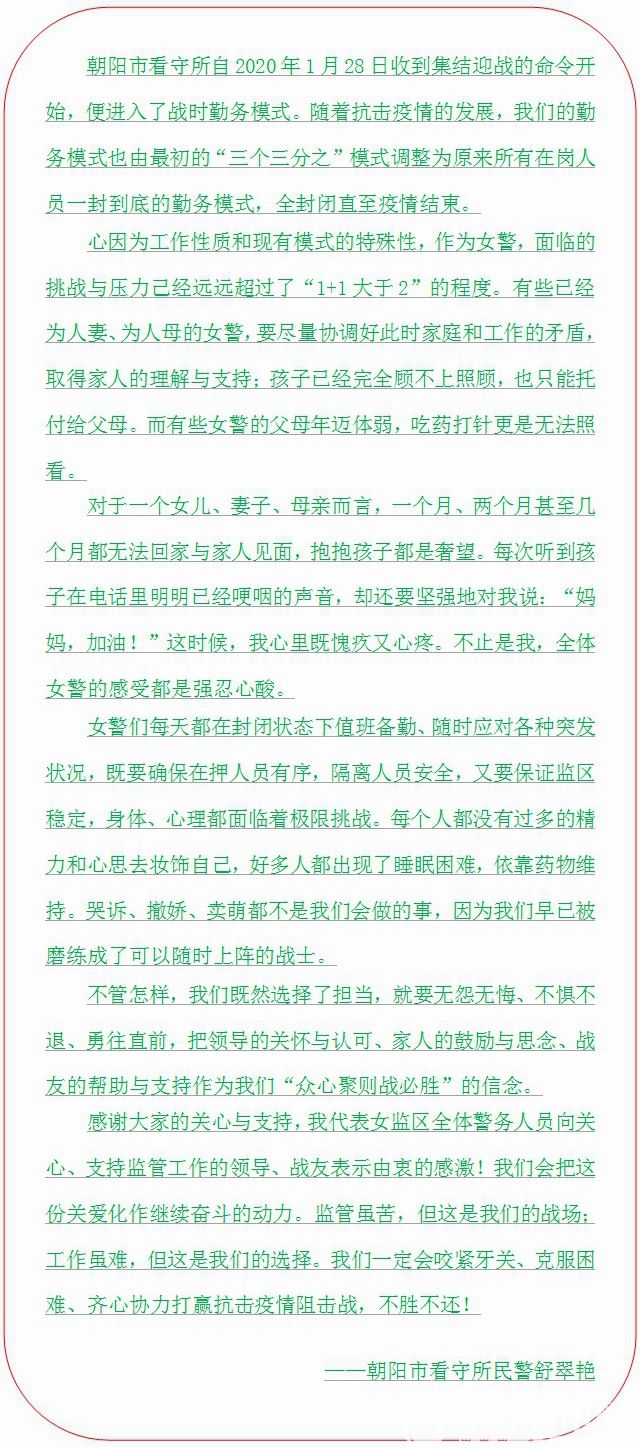 自1月28日,遼寧省朝陽市看守所全體工作人員實(shí)行全封閉工作模式,目前持續(xù)工作已達(dá)40余天,3月8日,微警事兒推出了《遼寧朝陽:孩子的一句“媽媽加油!”看哭了,向女警們致敬!》,該文章推出后,在警界內(nèi)外引起了強(qiáng)烈反響,網(wǎng)友們紛紛留言對朝陽市看守所女警們在疫情防控期間的超常付出表達(dá)了敬意。