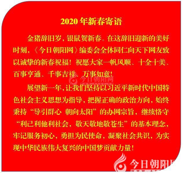 摘要:金豬辭舊歲,銀鼠賀新春。在這辭舊迎新的美好時(shí)刻,《今日朝陽(yáng)網(wǎng)》編委會(huì)全體同仁向天下網(wǎng)友致以誠(chéng)摯的新春祝福!祝愿大家一帆風(fēng)順、十全十美、百事亨通、千事吉祥、萬(wàn)事如意!