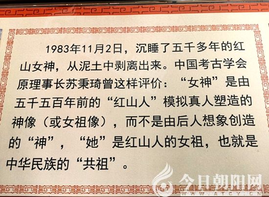 1983年11月2日上午,在試掘現(xiàn)場西側(cè)室露出一個(gè)圓圓的陶件,人們都意識到這可能是人頭塑像。大家都不做聲,現(xiàn)場靜得只聽到小鏟刮土那清晰而緩慢的沙沙聲。先露出額頭,繼而是眼睛、嘴巴,一個(gè)完整的女性頭像展現(xiàn)出來,她仰面朝天,雙目圓睜,略帶微笑,似乎早已在等待著與5000年后的“子孫”們見面。大家異口同聲地喊出“女神”,攝影師李振石抓拍了這一場面。照片以“五千年后的歷史性會(huì)面”為題,參加當(dāng)年省旅游攝影展,獲得一等獎(jiǎng)。省文物考古研究所女考古專家魏凡,在試掘現(xiàn)場的地上鋪上一塊木板,木板上又鋪上一塊紅色絨布,專家們小心翼翼地將女神請出來,放到絨布上。她雙手捧著女神,昂首挺胸,身披晚霞,神圣地走出叢林,走下山崗,走回馬家溝住地。自此,這一地點(diǎn)被編號為牛河梁第一號地點(diǎn),命名為“女神廟”,女神塑像命名為“紅山女神”。