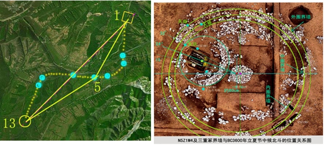 天地祭壇之間均勻分布7個(gè)呈反S形建在山崗之巔的積石冢群,與北斗七星對應(yīng)。與女神廟的7尊女祖神像相呼應(yīng)。因?yàn)樵谶@7個(gè)積石冢地點(diǎn)中處于中心的第五地點(diǎn)(也是整個(gè)遺址的核心)一號冢的設(shè)計(jì)也是按北斗七星天象設(shè)計(jì)的。天文軟件顯示,墓主人的位置與當(dāng)時(shí)的立夏節(jié)北斗玉衡的位置吻合,三重冢界墻與天璇、天樞和天璣三星的繞極軌道吻合。