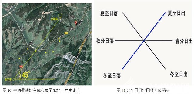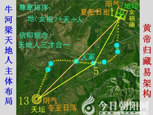 我們利用谷歌地圖和圖像軟件制圖,發(fā)現(xiàn)第一地點(diǎn)女神廟和第十三地點(diǎn)“金字塔”式建筑的連線是標(biāo)準(zhǔn)的“東北—西南”方向,與東西方向成45°角。這在整個(gè)遺址中可以作為一種“天文準(zhǔn)線”,表示古代天文學(xué)概念中“四維”中的“東北”與“西南”二維?!痘茨献?middot;天文訓(xùn)》中記載:“日冬至,日出東南維,入西南維。至春、秋分,日出東中,入西中。夏至出東北維,入西北維。至則正南。”東北維是夏至日出方位,西南維是冬至日落方位。此二維顯然可以構(gòu)成一年之中代表陰陽盛極的兩個(gè)時(shí)間節(jié)點(diǎn)的方位坐標(biāo)。雖然這與實(shí)際觀測的牛河梁地區(qū)日出日落方位角度不符,但這種理想模式應(yīng)該是一種觀念上的東西,是為了正“四維”而確立的天文準(zhǔn)線。