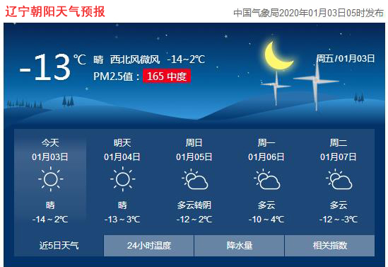 摘要:今天是2020年1月3日,星期五,農(nóng)歷臘月初九,二九第四天。遼寧朝陽晴,氣溫-14~2℃,西南風(fēng)微風(fēng),空氣質(zhì)量輕度污染。日出時間:07:25;日落時間:16:39