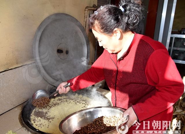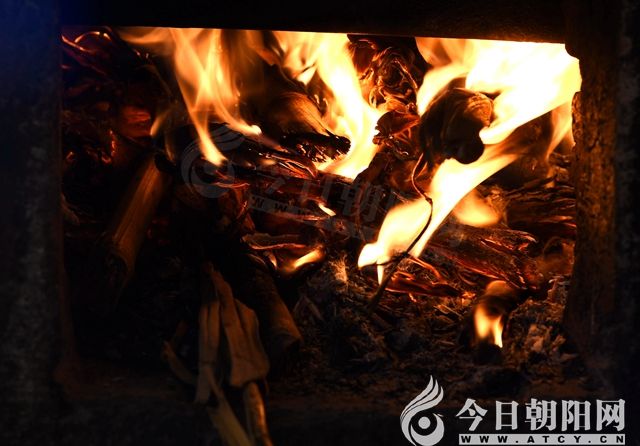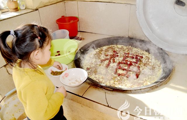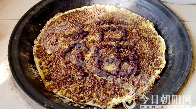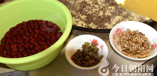 年糕的作法是將黃米面放盆內(nèi),摻水?dāng)嚢柚潦治彰婺艹蓤F(tuán)兒為宜。如果不成團(tuán)兒,往盆里用噴壺灑水,切記慢灑少灑,必須試著來,同時(shí)用筷子上下左右翻動(dòng),攪拌均勻,至手握成團(tuán)兒為止。然后,將大鐵鍋刷洗干凈,填足了水,放上用高粱秸稈做的篦簾子,篦簾子上鋪一層提前泡好的紅小豆、江豆、蕓豆、花生、核桃仁、大棗、葡萄干等食物,鄉(xiāng)親們稱這些為配料。第一層配料要放得密實(shí)一些,以確保拌好的黃米面不會(huì)漏進(jìn)鍋里。之后,用手把拌好的黃米面抓到配料上邊,放的時(shí)候要輕,放一層面,面上再放一層配料,這樣反復(fù)幾次,最后一層面用粗一點(diǎn)的籮篩找平,在平平的面上再用花生仁、青紅絲等有顏色的東西擺成“新年快樂”“連年有余”等祝福的文字,最后蓋嚴(yán)了鍋蓋。這個(gè)鍋蓋一定是用高粱秸稈制作的,這樣的鍋蓋透氣,不至于出鍋的時(shí)候年糕上邊都是水。這時(shí)候灶膛內(nèi)加火,正常情況都燒高粱秸稈。蒸年糕添火也是一門藝術(shù),要求是均勻還不糊鍋。當(dāng)整口鍋都散發(fā)著濃濃的水蒸氣后,調(diào)成小火再蒸大約60分鐘就熟了。