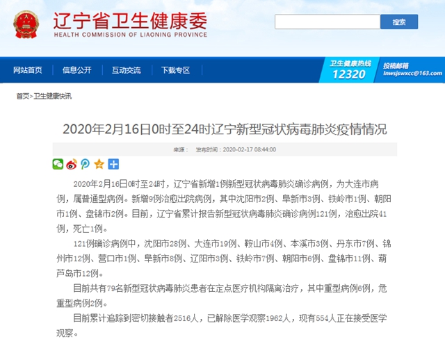 原文鏈接:2020年2月16日0時至24時遼寧新型冠狀病毒肺炎疫情情況