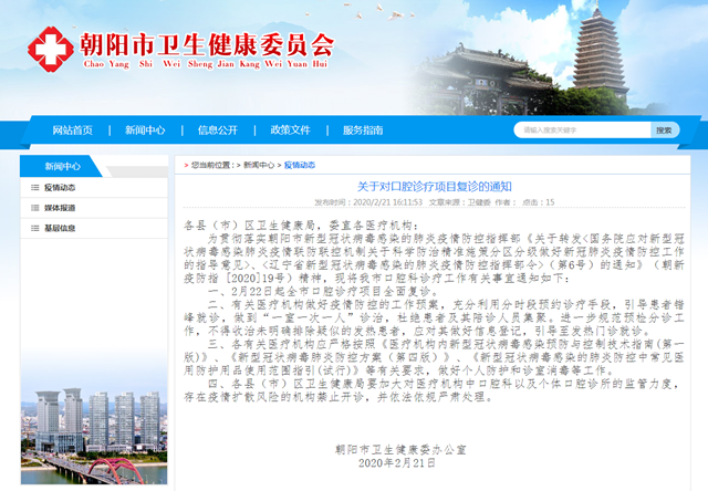 為貫徹落實朝陽市新型冠狀病毒感染的肺炎疫情防控指揮部《關(guān)于轉(zhuǎn)發(fā)<國務(wù)院應(yīng)對新型冠狀病毒感染肺炎疫情聯(lián)防聯(lián)控機制關(guān)于科學(xué)防治精準施策分區(qū)分級做好新冠肺炎疫情防控工作的指導(dǎo)意見>、<遼寧省新型冠狀病毒感染的肺炎疫情防控指揮部令>(第6號)的通知》(朝新疫防指 [2020]19號)精神,現(xiàn)將我市口腔科診療工作有關(guān)事宜通知如下: