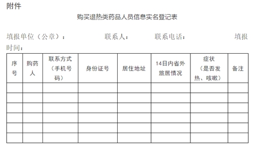 一、各零售藥店在銷售退熱類藥品時,要嚴格查驗身份并進行實名信息登記,如實填寫《購買退熱類藥品人員信息實名登記表》(見附件),并告知發(fā)熱人員應主動前往發(fā)熱門診就診。各零售藥店要于每日15時前將24小時內采集的信息匯總報所在縣(市、區(qū))市場監(jiān)管部門,市場監(jiān)管部門于當日匯總報縣(市、區(qū))疫情防控指揮部。如發(fā)現(xiàn)有重點地區(qū)旅居史的要立即報送。
