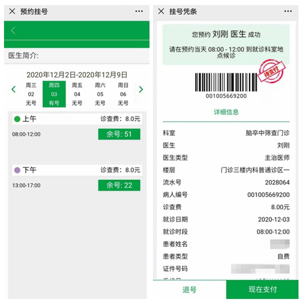 選擇醫(yī)生后,點(diǎn)擊進(jìn)入選擇就診日期和時(shí)段頁(yè)面,選擇有余號(hào)的時(shí)間段掛號(hào),確定后支付掛號(hào)費(fèi),完成預(yù)約。