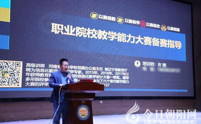 4月1日下午,遼寧省朝陽(yáng)工程技術(shù)學(xué)校在報(bào)告廳舉辦了教師教學(xué)能力大賽專(zhuān)題培訓(xùn)講座。講座邀請(qǐng)了遼寧省信息化教學(xué)大賽評(píng)審專(zhuān)家,2015年—2017年連續(xù)三年教育部職業(yè)院校信息化教學(xué)設(shè)計(jì)大賽一等獎(jiǎng)獲得者、河南省“教學(xué)名師”、河南省商務(wù)學(xué)校許剛教授作題為《職業(yè)院校教學(xué)能力大賽備賽指導(dǎo)》的專(zhuān)題講座。市教育局高職成科科長(zhǎng)陳昭宇,學(xué)校黨委書(shū)記、校長(zhǎng)武鐵兵,副校長(zhǎng)陳塞月、劉文光出席講座,朝陽(yáng)師專(zhuān)、衛(wèi)校、財(cái)校、體校部分教師與工校教師一起聆聽(tīng)了本次講座。講座由教務(wù)科科長(zhǎng)徐柏林主持。