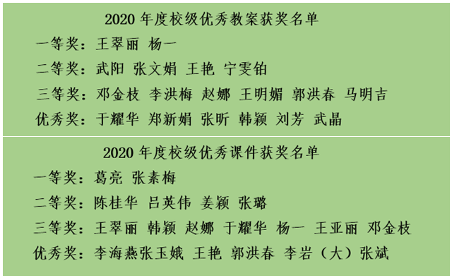 此次活動旨在充分發(fā)揮教案、教學(xué)設(shè)計在教學(xué)中的作用,促進課程教學(xué)內(nèi)容更新、教學(xué)方式與手段轉(zhuǎn)變,不斷提高教師的教學(xué)水平和課堂教學(xué)質(zhì)量。評選分別設(shè)置一等獎、二等獎、三等獎和優(yōu)秀獎。經(jīng)教學(xué)部初評推薦,學(xué)校評審組本著公平、公正、公開的原則,按照優(yōu)秀教案、優(yōu)秀課件評分標準進行評選,王翠麗、武陽、鄧金枝等12位教師分獲優(yōu)秀教案一二三等獎;葛亮、陳桂華、韓穎等13位教師分獲優(yōu)秀課件一二三等獎;于耀華、李海燕等12人獲得教案、課件優(yōu)秀獎。