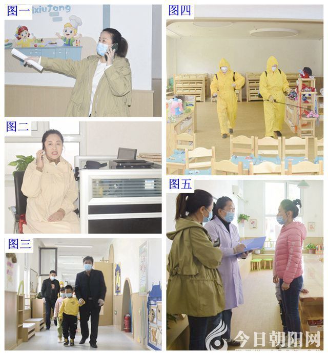 圖一、圖二:副園長(zhǎng)袁秋梅將幼兒情況上報(bào)給防控領(lǐng)導(dǎo)小組總指揮潘淑玲;圖三:疏散組帶領(lǐng)師生撤離至生活坊;圖四:消毒人員對(duì)班級(jí)進(jìn)行消毒;圖五:保健醫(yī)向班主任了解相關(guān)情況。