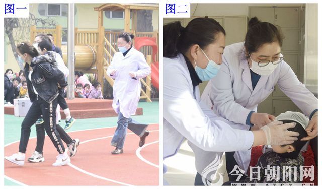 圖一:教師將受傷幼兒從教室背出;圖二:救護(hù)組為幼兒包扎。