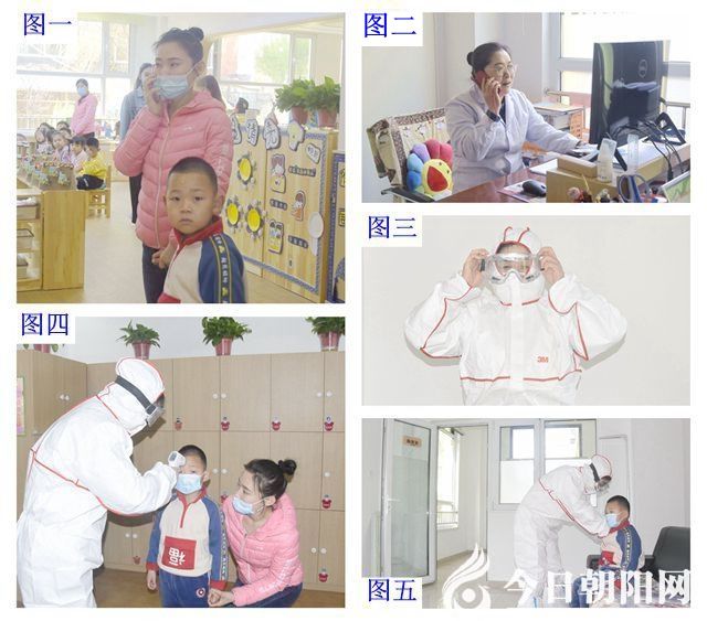 圖一、圖二:中一班有一名幼兒發(fā)燒,班主任報(bào)告保健醫(yī);圖三:保健醫(yī)迅速穿好防護(hù)服;圖四、圖五:保健醫(yī)分別在班級(jí)和隔離室為發(fā)燒幼兒測(cè)體溫。